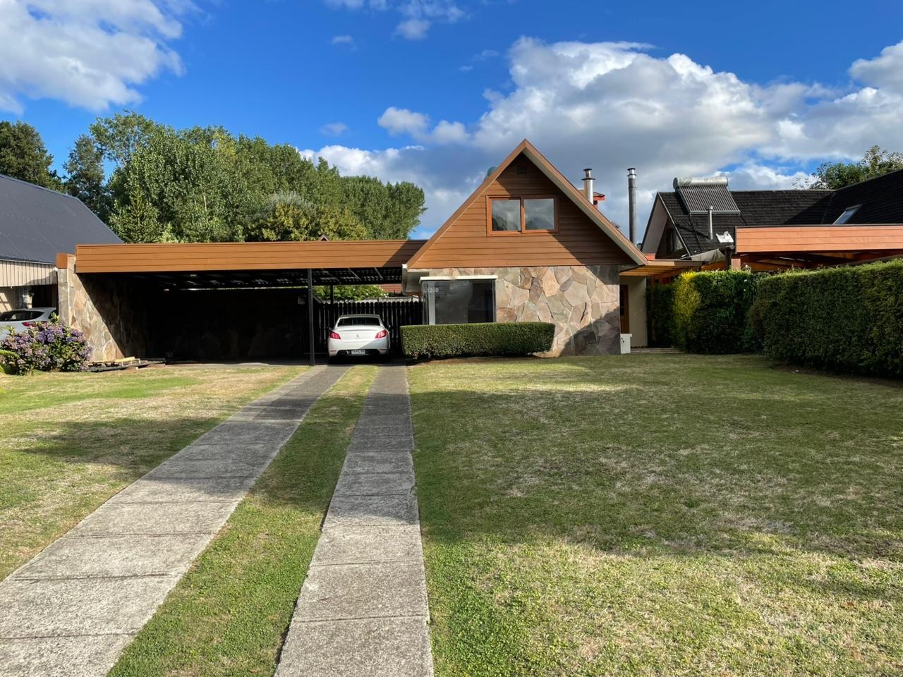 Estacionamiento techado para 3 vehículos y al menos otros 2 vehículos no techado.