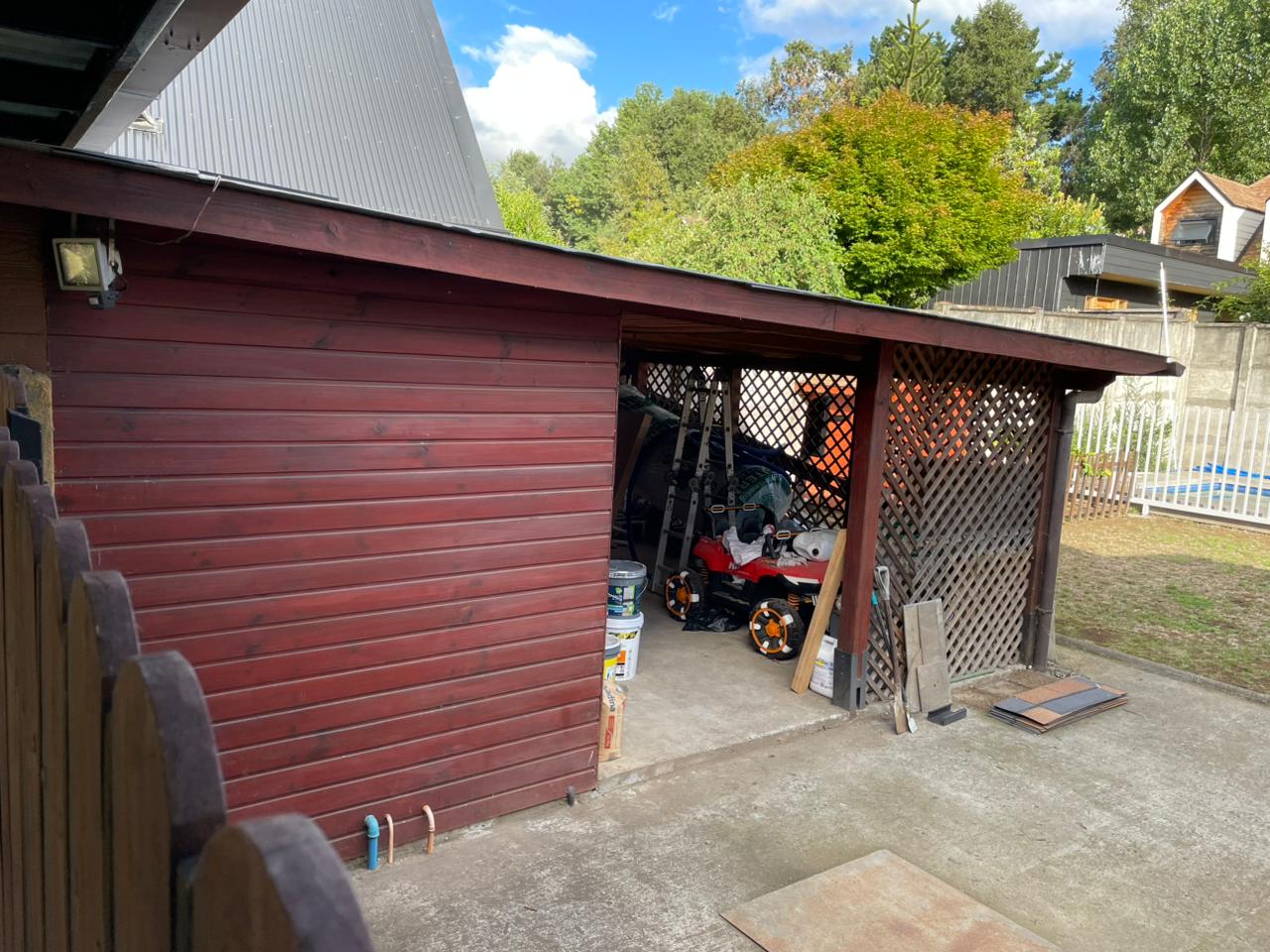 Piscina con espacio cerrado con reja de seguridad y separado de 1 terraza descubierta para reposaderas o asientos – Bodega para guardar artículos mayores o leña, etc.